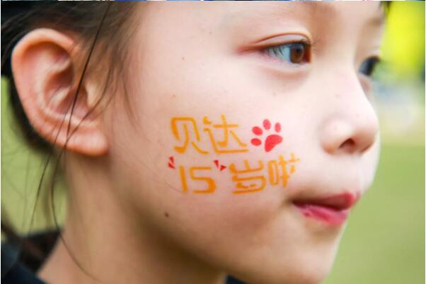 完赛后选手们聚集在主会场大草坪,齐心协力展开象征着团结、奋发、进取的家庭乐跑大赛旗帜,向着天空大声喊出“与爱同行,我爱贝达!”